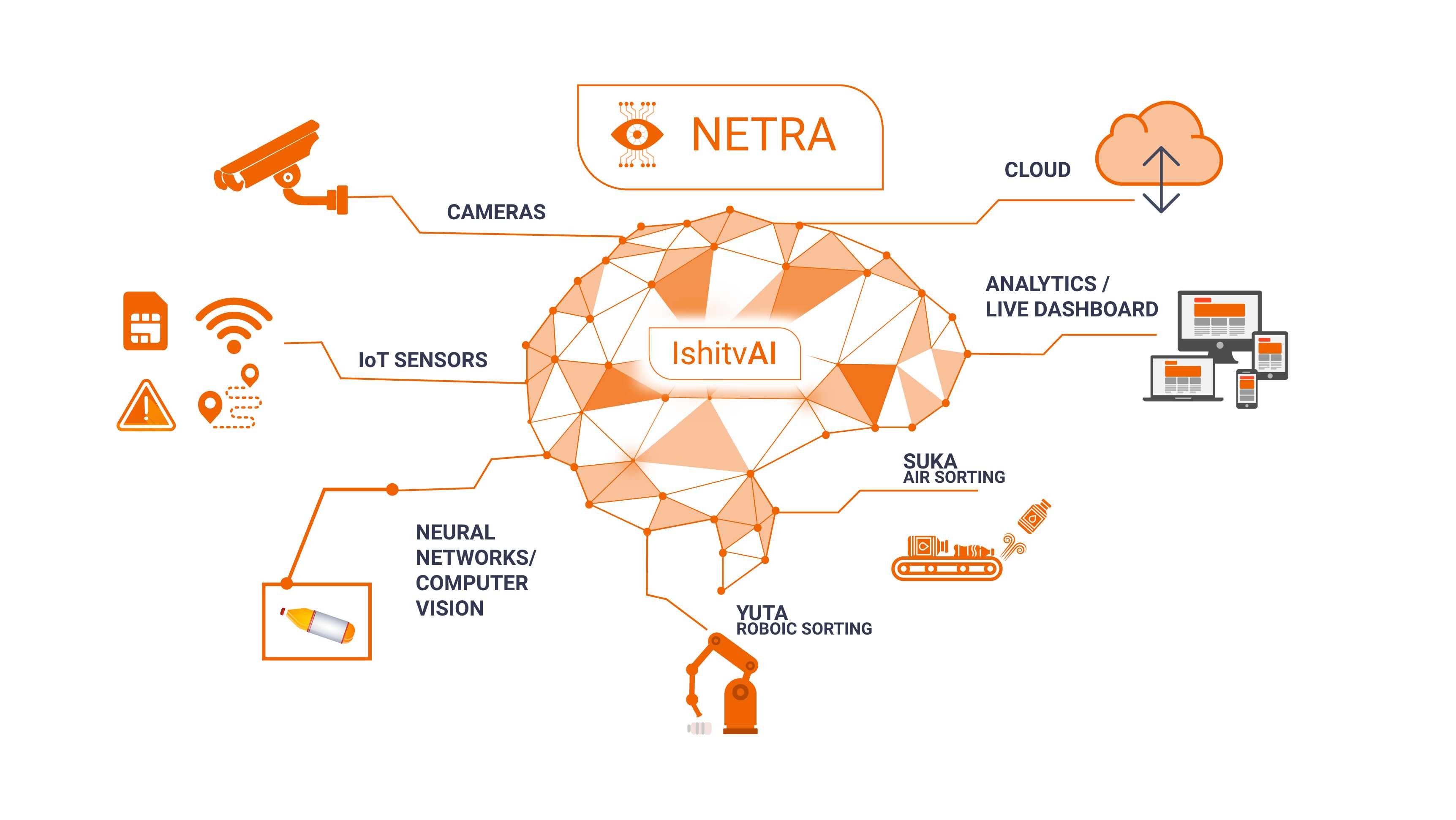 NETRA provides high end machine vision plug and play features such as integration with any industrial sensors and high end cameras (2D, 3D and hyperspectral cameras), providing complex computer vision algorithms from learning to classificaiton, localization, segmentation and later integrating with different industrial robots, air sorters or any mechanical unit.